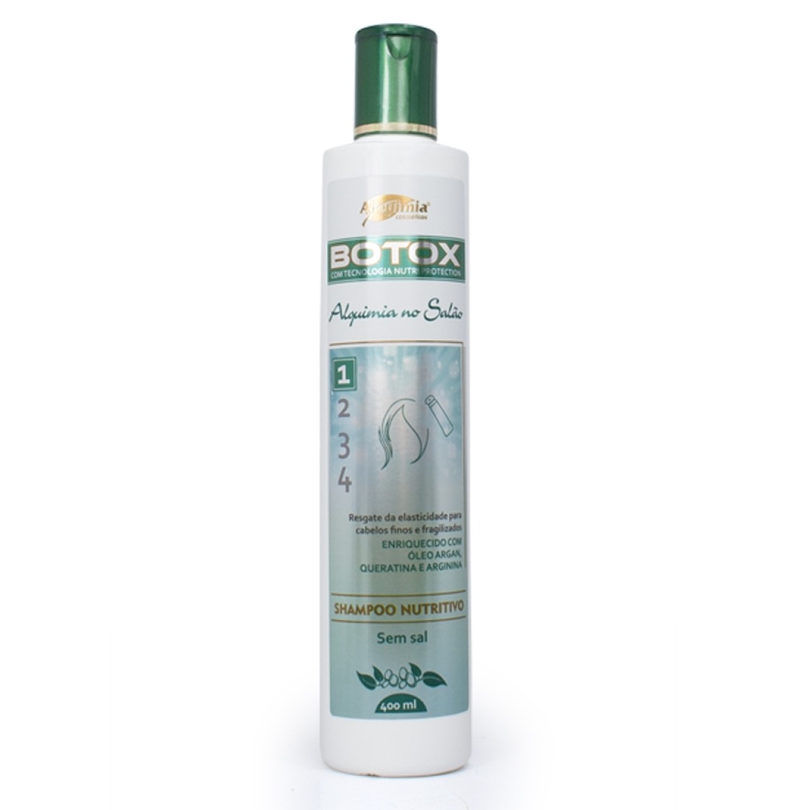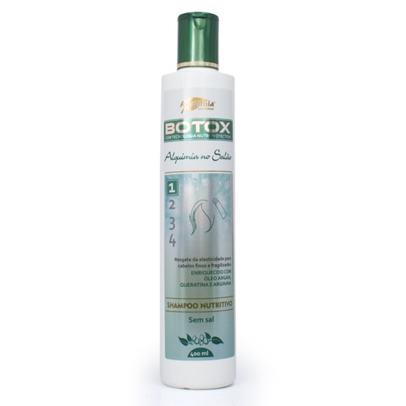 O Shampoo Nutritivo Alquimia no Salão Botox possui Tecnologia Nutri Protection, que incorpora o poder antioxidante dos ômegas 3, 6 e 9, a reestruturação e a reposição de massa capilar, presentes no óleo de argan, argina e queratina. Além disso proporciona plástica para os fios, resgata a elasticidade da fibra capilar e melhora a nutrição da raiz até as pontas, sem que o cabelo fique enrijecido. 400 ml