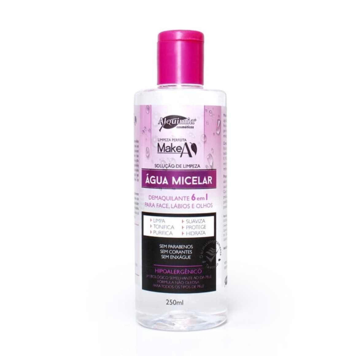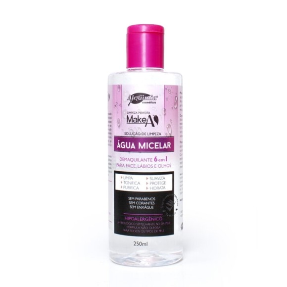 Água MicelarÁgua Micelar é a maravilha da Alquimia Cosméticos, que acertou em cheio na necessidade do mundo moderno por produtos multifuncionais e eficientes, pois diferente dos demaquilantes bifásicos ou alcoólicos, é uma opção de higiene que substitui o sabonete, o demaquilante e o tônico. Ao ser aplicada sobre a pele, as micelas se abrem, de modo que ocorre a absorção dos resíduos, o alto poder de limpeza elimina as impurezas e remove a maquiagem.Sua fórmula hipoalergênica é dermatologicamente testada e pode ser utilizada para limpeza diária da pele, pela manhã, para remover a oleosidade noturna e deixar a pele sequinha para o trabalho. À tarde, para remover a poluição do dia a dia e à noite, após o banho, para dormir revigorada. 250 ml.MODO DE USAR: Aplicar com o auxílio de um algodão, sobre a pele do rosto, lábios e olhos. Repita a aplicação até que a pele esteja perfeitamente limpa. Não necessita de enxágue.PRECAUÇÕES: Mantenha o produto fora do alcance de crianças e animais domésticos. Em caso de ingestão, procure um serviço de saúde. Caso haja irritação, suspenda o uso do produto. Caso o produto seja exposto ao sol, pode ficar ligeiramente amarelado, porém suas propriedades são mantidas.